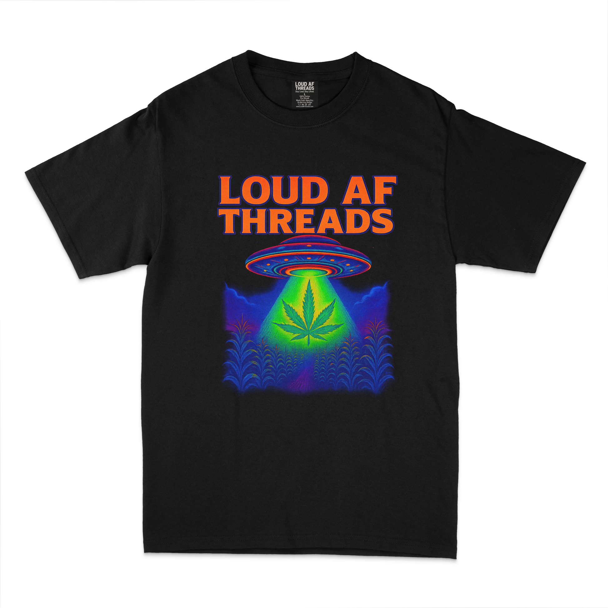 Get beamed up in style with Abducted & Lifted, a Loud AF Threads exclusive. This psychedelic tee features a trippy UFO lighting up a glowing cannabis leaf in the middle of a cornfield, blending extraterrestrial vibes with cannabis culture. Bold neon gradients and retro fonts take this design to another dimension. Whether you’re blazing up or vibing out, this shirt guarantees you'll stay loud, stay lifted—and maybe get abducted in the best way.